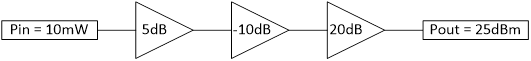 Pout = 10dBm + 5dB - 10dB + 20dB = 25dBm