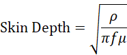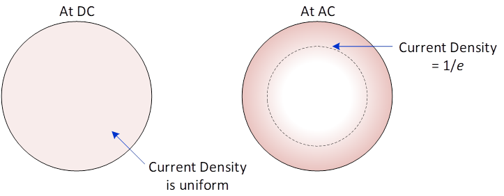 At DC, current density is distributed throughout a conductive material. As frequency increases, the depth of current density decreases. The current density depth is called “Skin Depth”.